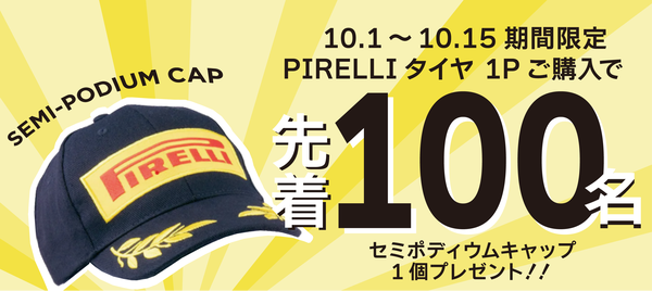 期間中ピレリのタイヤ1セット(2本)購入で、キャンペーンに申し込みすることができます。先着100名様にピレリ ポディウムキャップがプレゼント(後日ご自宅に配送となります)されます。