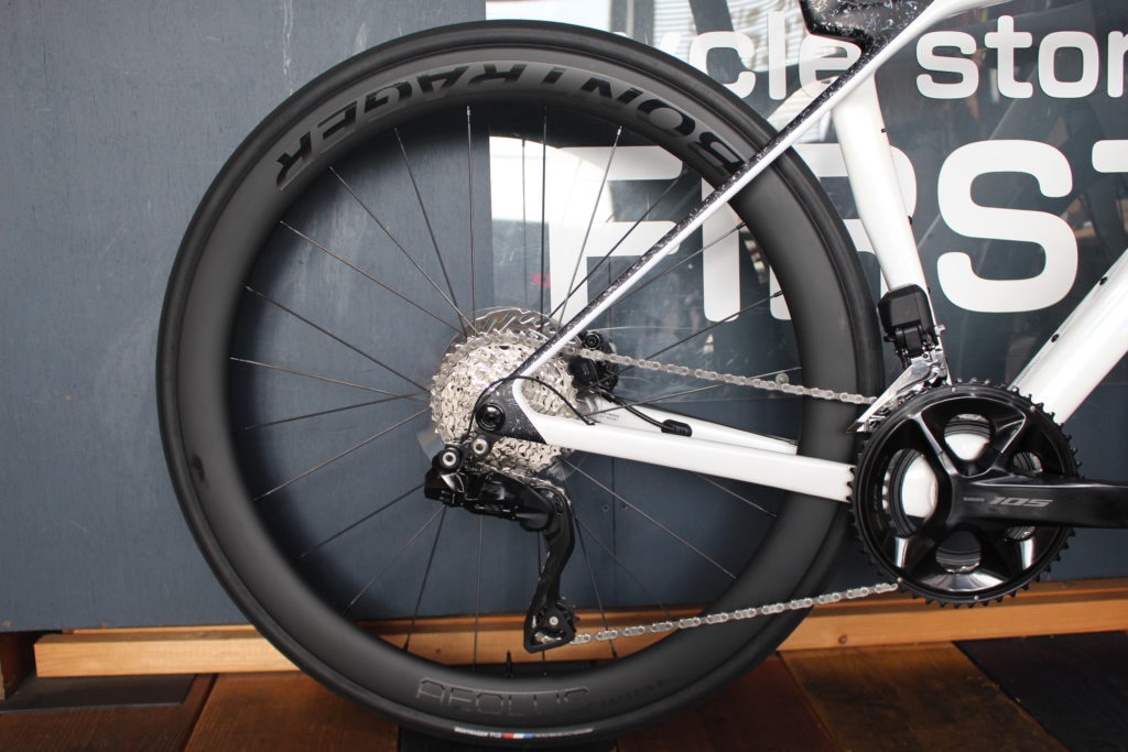 MADONE SL6には、コンポーネント:シマノ105Di2とアイオロス エリート50のカーボンホイールがアッセンブルされます。ちなみにチューブレスレディ仕様となっています。